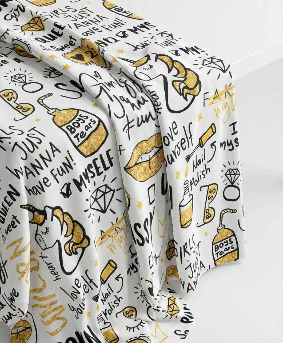 Unicorn ve Kız Temalı Kumaş serisiyle dikiş projelerinize ışıltı katın! Altın sarısı detaylar, zarif unicorn figürleri ve özgüven dolu mesajlarla harmanlanan bu özel koleksiyon, %83 pamuk yoğunluklu premium süprem dokusuyla konforu ve stili bir araya getiriyor. Kristal netliğindeki dijital baskı teknolojisi, tasarımdaki elmas parıltılarını ve “Boys Tears” gibi esprili detayları kumaşın ipeksi yüzeyine kusursuzca işliyor.